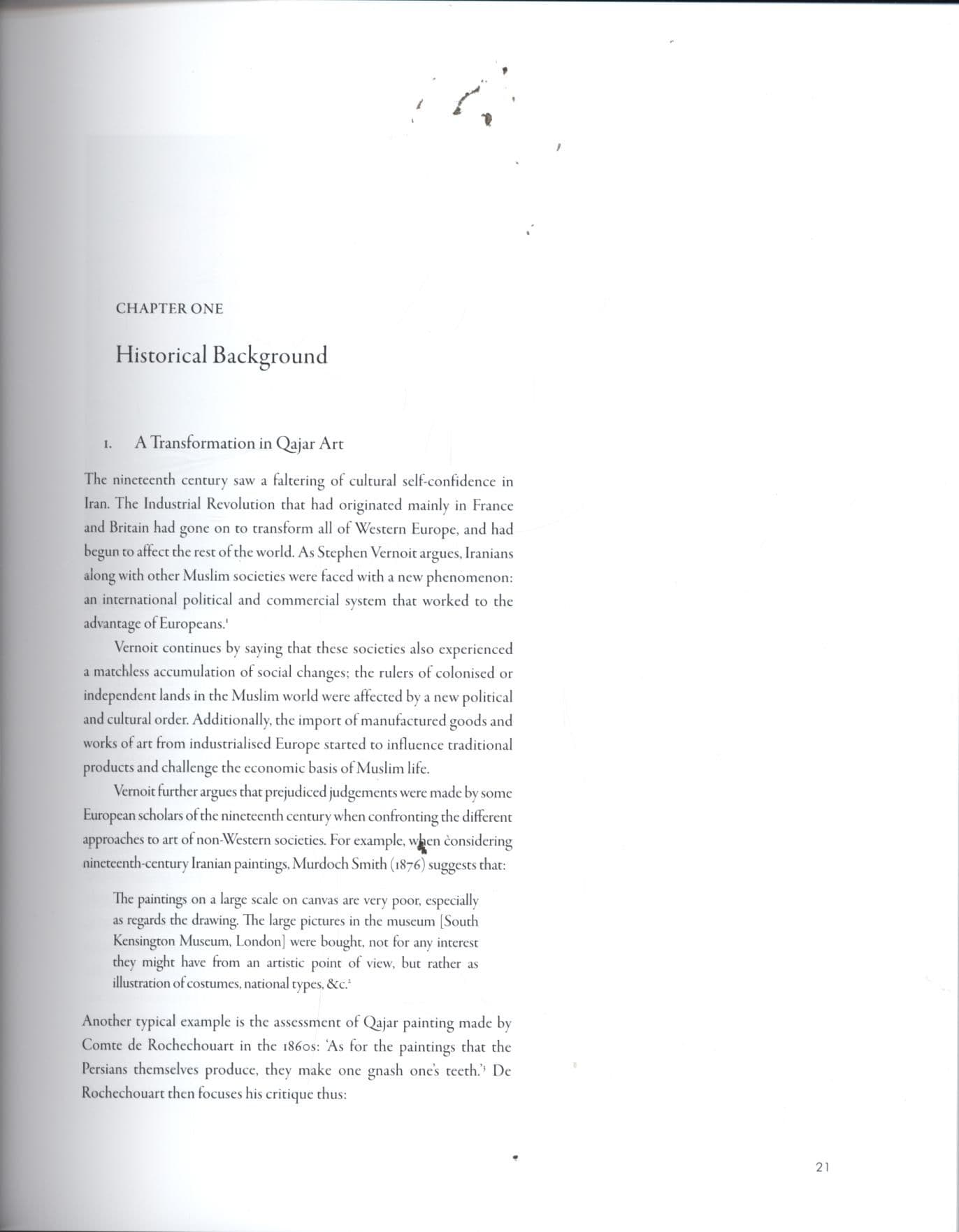 وهو يؤكد أن القرن العشرين على وجه الخصوص كان بمثابة فترة حاسمة في فن وثقافة إيران. في ذلك الوقت، خضع تراث التقليد والحداثة لمراجعة نقدية، وكشفت الاهتمامات الفنية عن نفسها باعتبارها لا يمكن فصلها عن الاهتمامات الأيديولوجية.