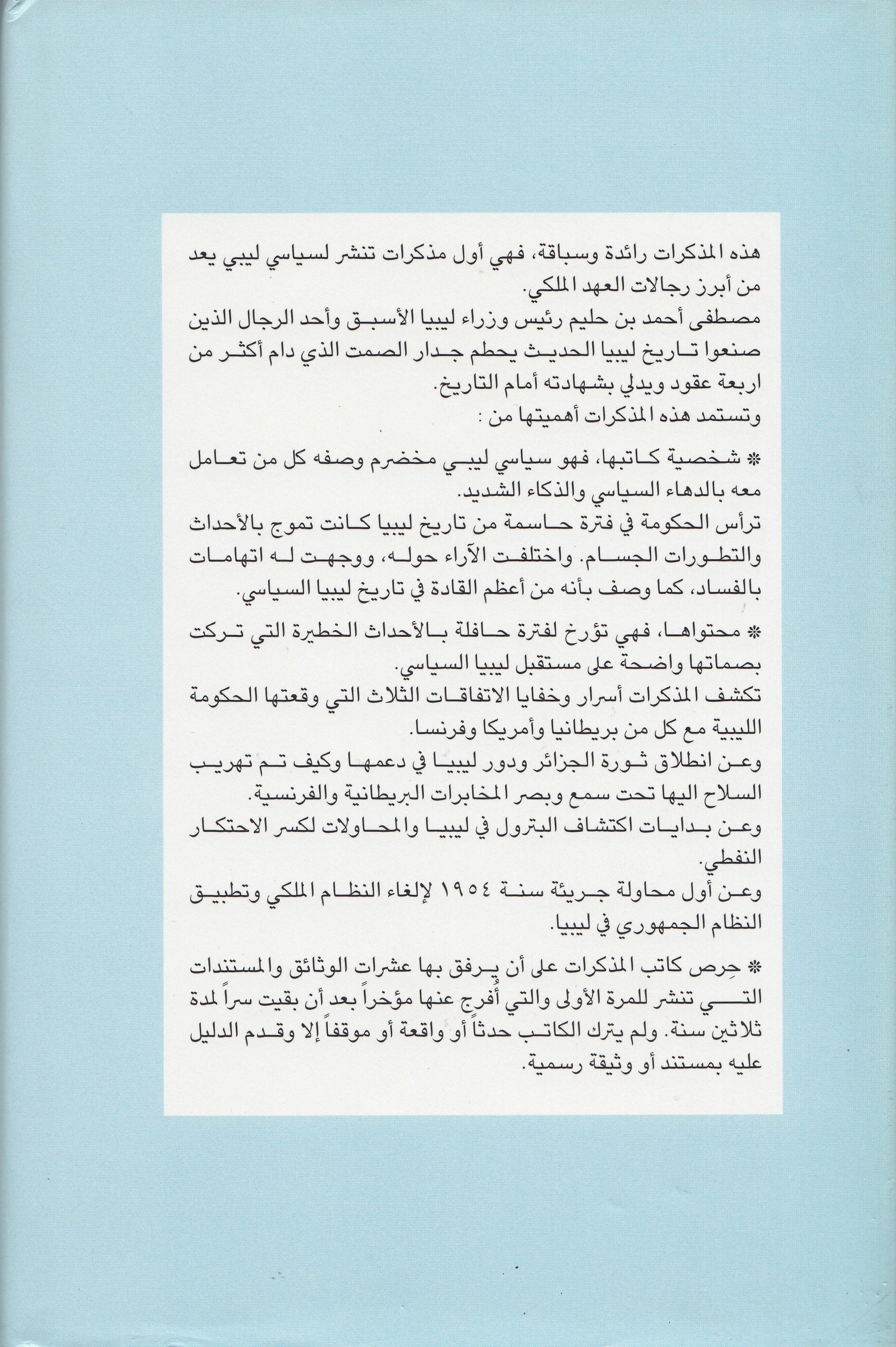 مصطفى أحمد بن حليم رئيس وزراء ليبيا الاسبق وأحد الرجال الذين صنعوا تاريخ ليبيا الحديث يحطم جدار الصمت الذي دام أكثر من اربعة عقود ويدلي بشهادته أمام التاريخ. وتستمد هذه المذكرات اهميتها من: