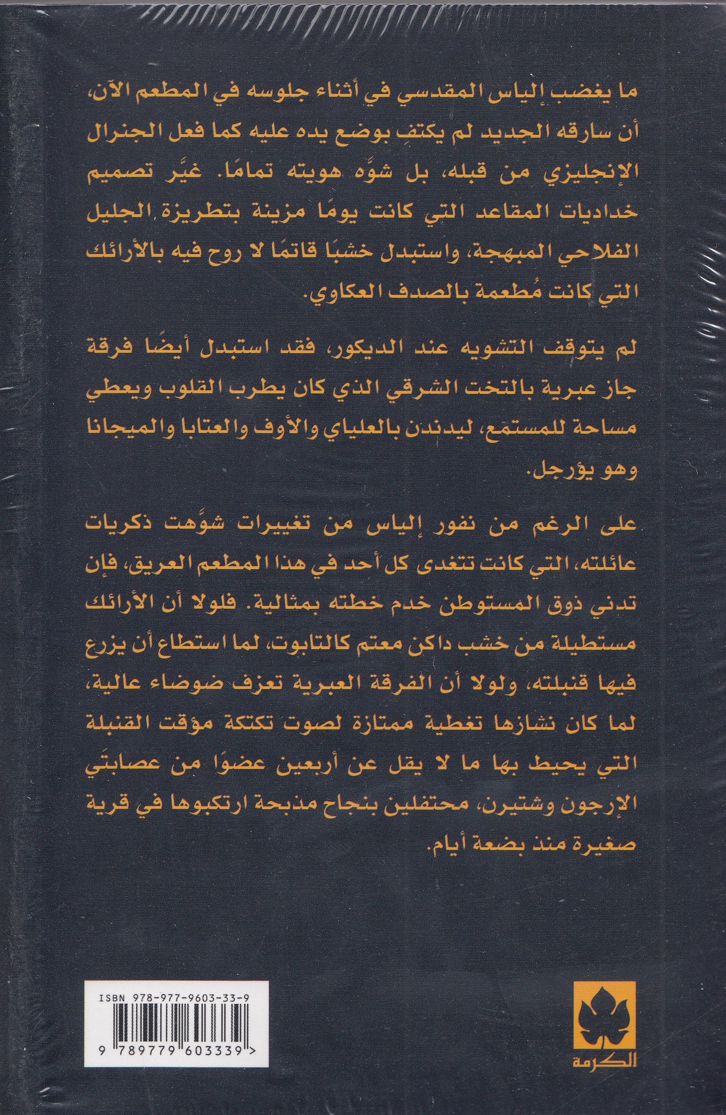 ما يغضب إلياس المقدسي في أثناء جلوسه في المطعم الآن، أن سارقه الجديد لم يكتفِ بوضع يده عليه كما فعل الجنرال الإنجليزي من قبله، بل شوَّه هويته تمامًا. غيَّر تصميم خداديات المقاعد التي كانت يومًا مزينة بتطريزة الجليل الفلاحي المبهجة، واستبدل خشبًا قاتمًا لا روح فيه بالأرائك التي كانت مُطعمة بالصدف العكاوي.
