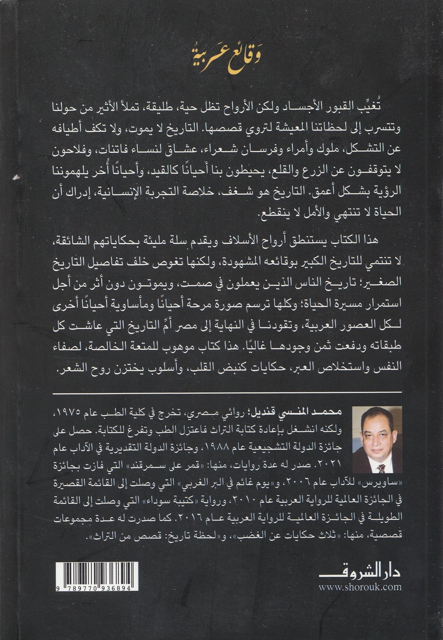 هذا الكتاب يستنطق أرواح الأسلاف ويقدم سلة مليئة بحكاياتهم الشائقة، لا تنتمي للتاريخ الكبير بوقائعه المشهودة، ولكنها تغوص خلف تفاصيل التاريخ الصغير؛ تاريخ الناس الذين يعملون في صمت، ويموتون دون أثر من أجل استمرار مسيرة الحياة؛ وكلها ترسم صورة مرحة أحيانًا ومأساوية أحيانًا أخرى لكل العصور العربية، وتقودنا في النهاية إلى مصر أمِّ التاريخ التي عاشت كل طبقاته ودفعت ثمن وجودها غاليًا. هذا كتاب موهوب للمتعة الخالصة، لصفاء النفس واستخلاص العبر، حكايات كنبض القلب، وأسلوب يختزن روح الشعر.