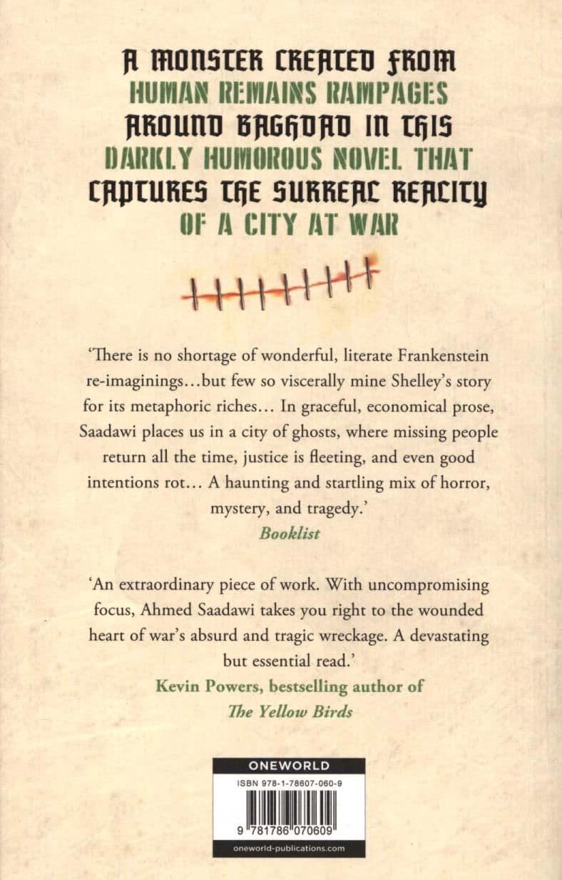 From the rubble-strewn streets of US-occupied Baghdad, the scavenger Hadi collects human body parts and stitches them together to create a corpse. His goal, he claims, is for the government to recognize the parts as people and give them a proper burial. But when the corpse goes missing, a wave of eerie murders sweeps the city, and reports stream in of a horrendous-looking criminal who, though shot, cannot be killed. Hadi soon realises he has created a monster, one that needs human flesh to survive – first from the guilty, and then from anyone who crosses its path.