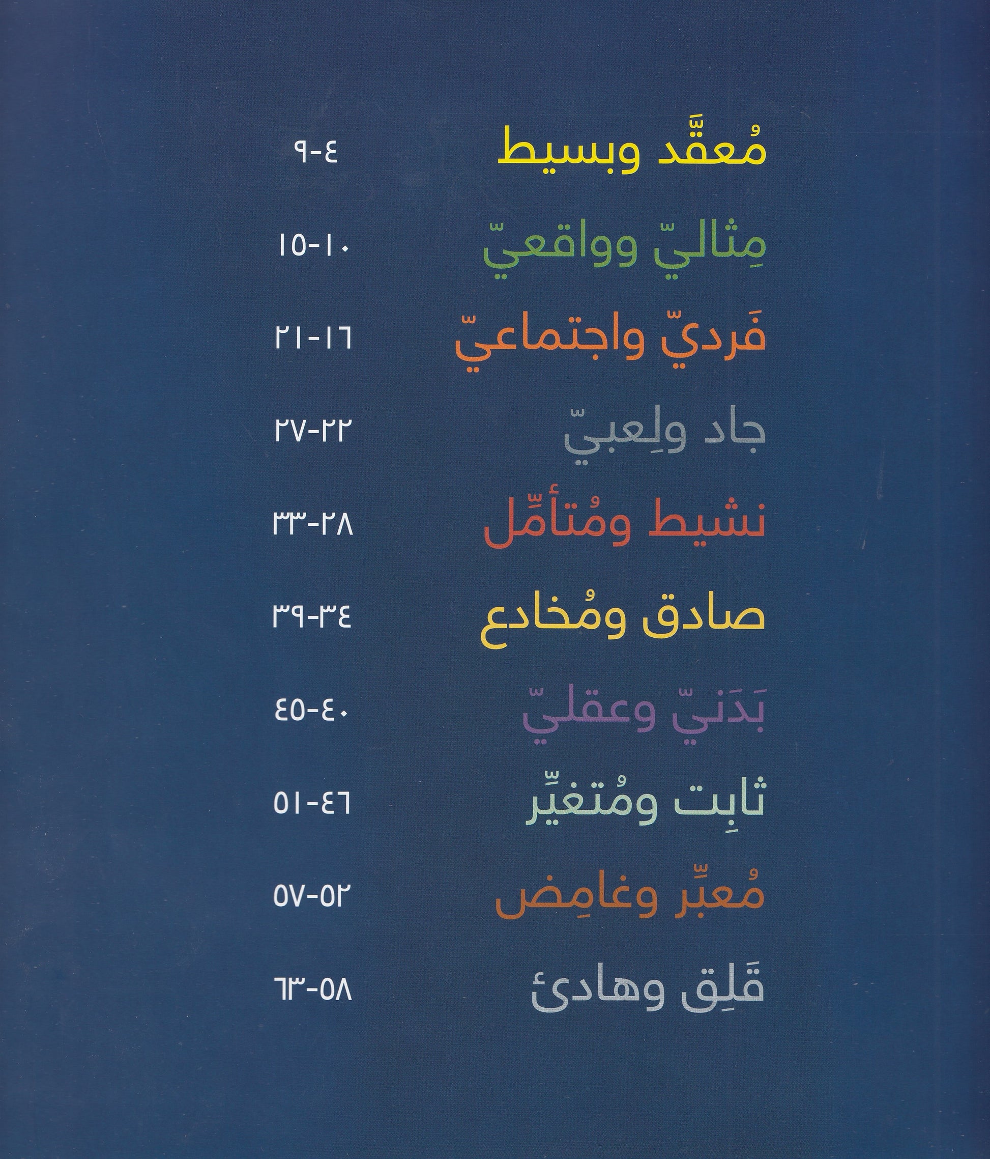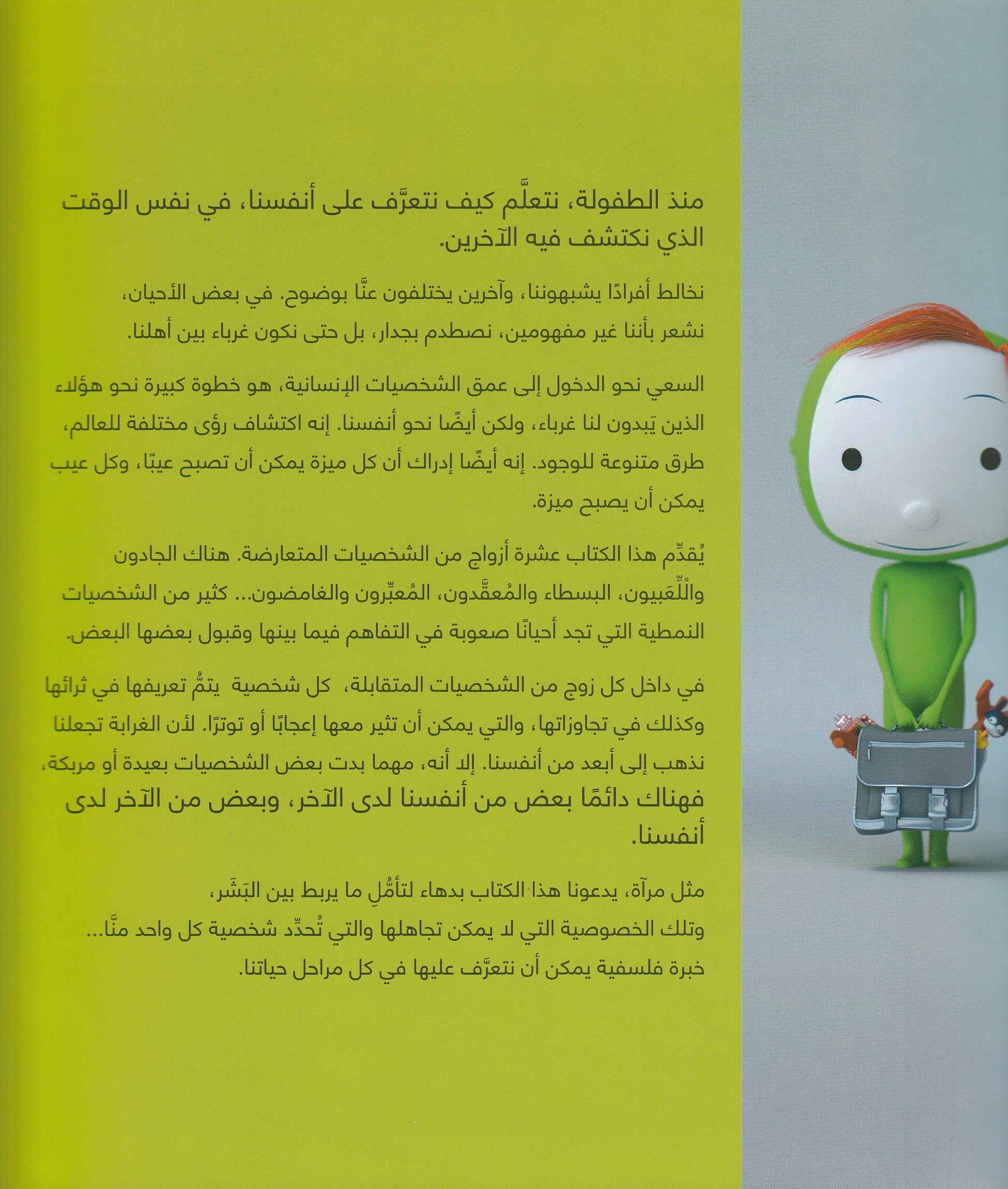 - منذ الطفولة، نتعلَّم كيف نتعرَّف على أنفسنا، في نفس الوقت الذي نكتشف فيه الآخرين.نخالط أفرادًا يشبهوننا، وآخرين يختلفون عنَّا. هناك الجادون واللِّعَبيون، البُسطاء والمُعقَّدون، المُعبِّرون والغامضون.