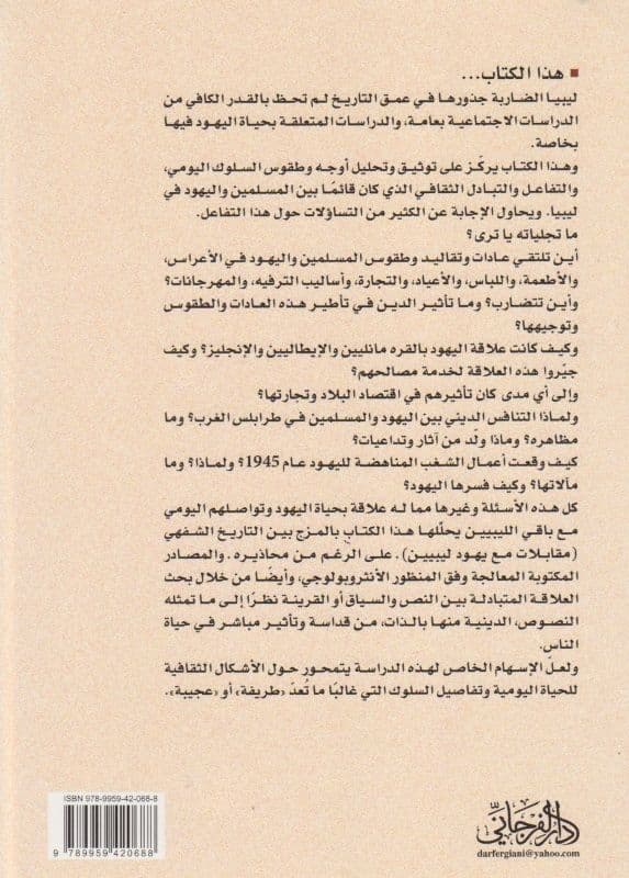 هذا الكتاب يركز على توثيق وتحليل أوجه وطقوس السلوك اليومي، والتفاعل والتبادل الثقافي الذي كان قائما بين المسلمين واليهود في ليبيا. ويحاول الإجابة عن الكثير من التساؤلات حول هذا التفاعل.