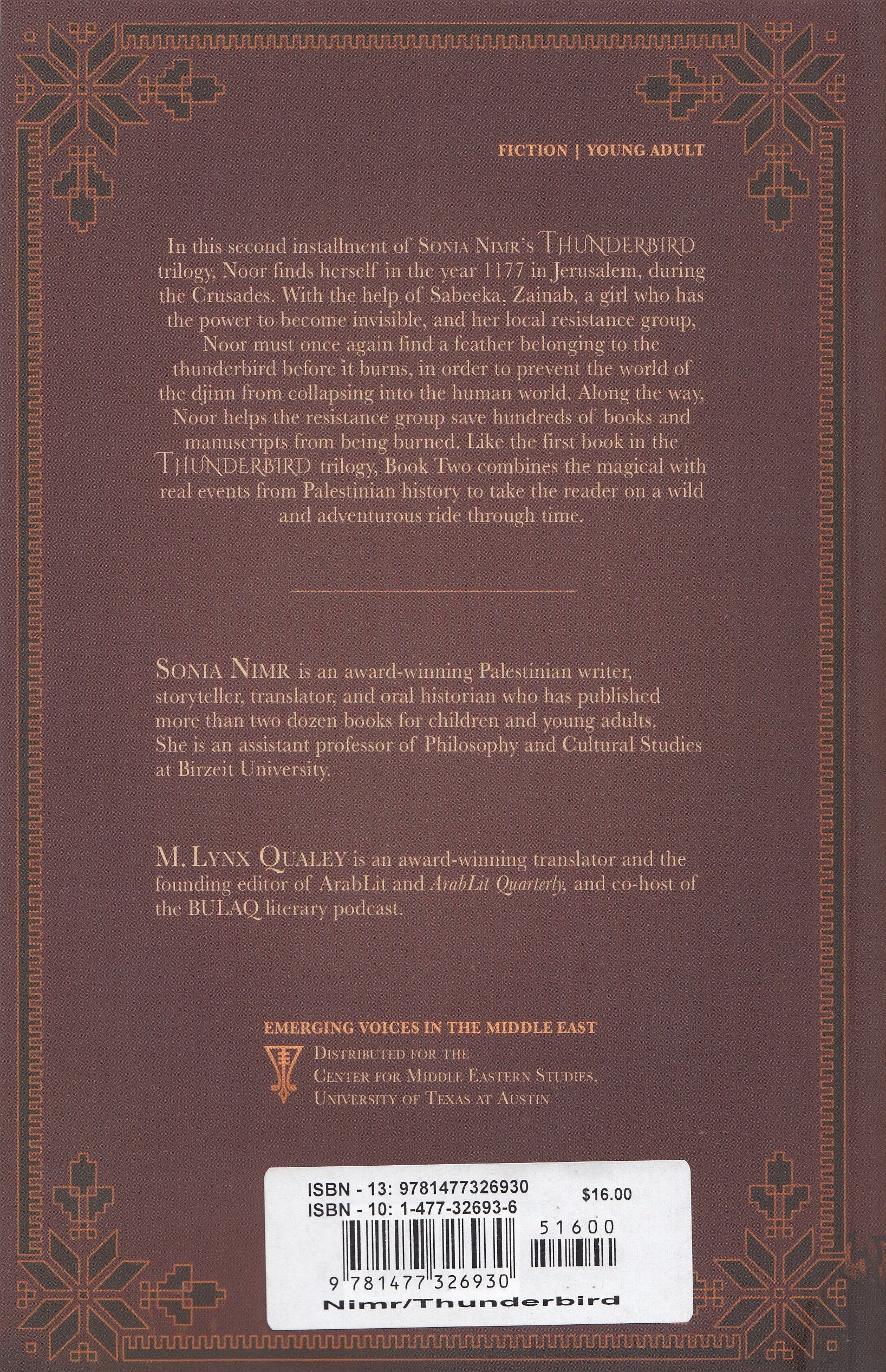 In this second installment, Noor finds herself in the year 1177 in Jerusalem, during the Crusades. With the help of Sabeeka, Zainab, a girl who has the power to become invisible, and her local resistance group, Noor must once again find a feather belonging to the thunderbird before it burns, in order to prevent the world of the djinn from collapsing into the human world. Along the way, Noor helps the resistance group save hundreds of books and manuscripts from being burned. Like the first book in the Thunderbird trilogy, Book Two combines the magical with real events from Palestinian history to take the reader on a wild and adventurous ride through time.
