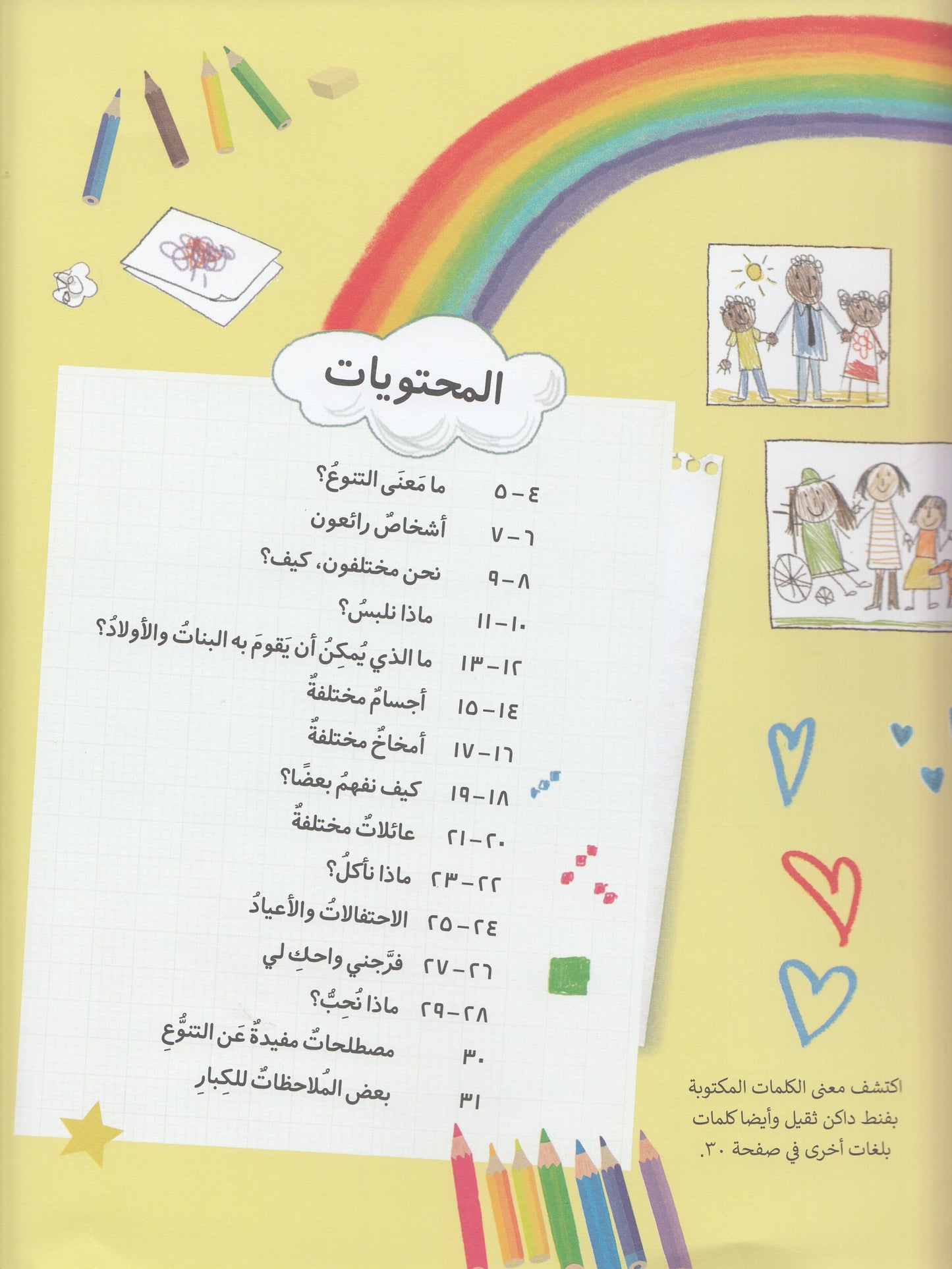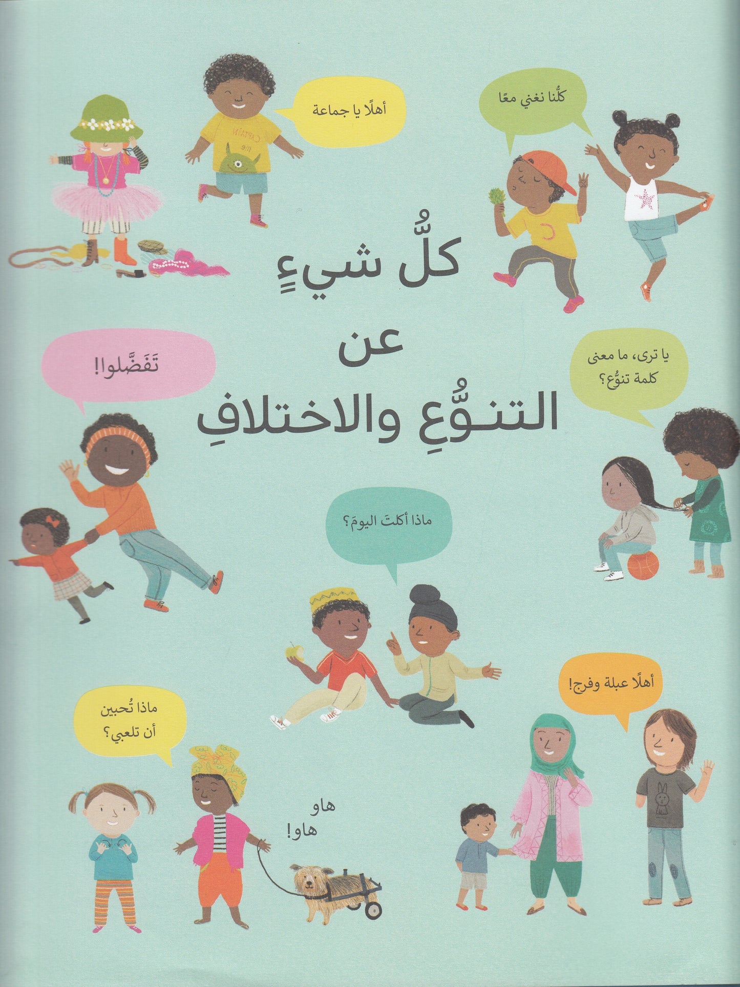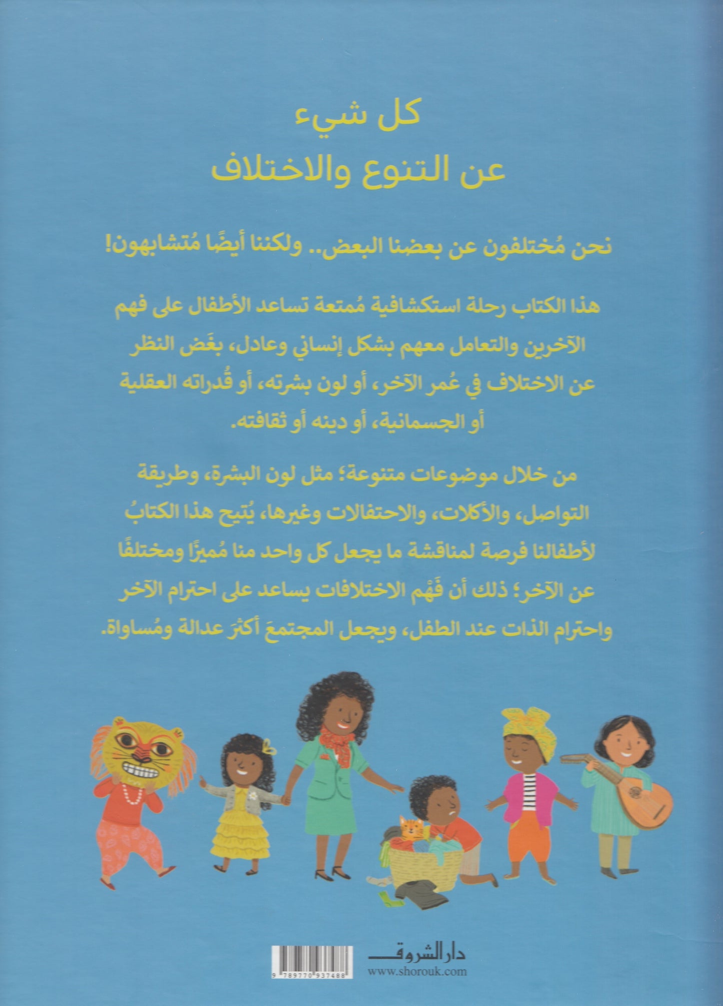 • يهدفُ هذا الكتابُ لأن يكونَ جزءًا من هذا الاحتفاء بالاختلاف والتنوُّع، وأن يساعدَ كلَّ الأطفال ليشعروا بالتقدير والاحترام، وأن يتعلموا التعامل مع الكل بأسلوب طيب وعادل بغضِّ النظر عن شكلهم أو حجمهم أو سِنِّهم أو قُدراتهم أو نَوعهم أو لون بشرتهم أو جنسيتهم أو مُعتقداتهم أو لُغتهم أو ثقافتهم أو عائلاتهم...