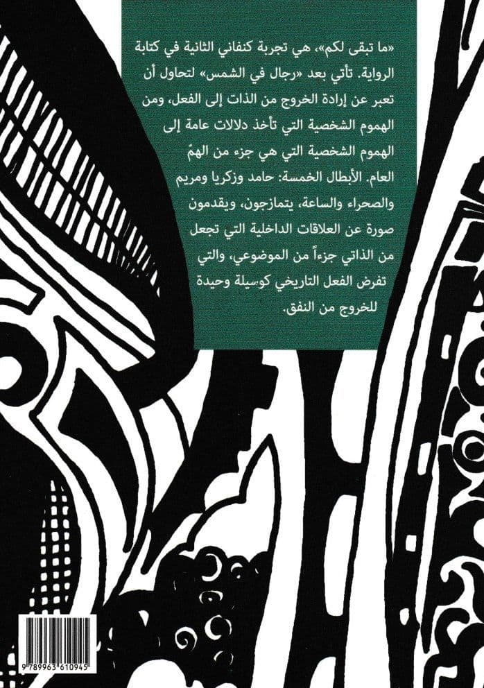 "ما تبقى لكم"، هي تجربة كنفاني الثانية في كتابة الرواية. تأتي بعد "رجال في الشمس" لتحاول أن تعبر عن إرادة الخروج من الذات إلى الفعل، ومن الهموم الشخصية التي تأخذ دلالات عامة إلى الهموم الشخصية التي هي جزء من الهمّ العام.